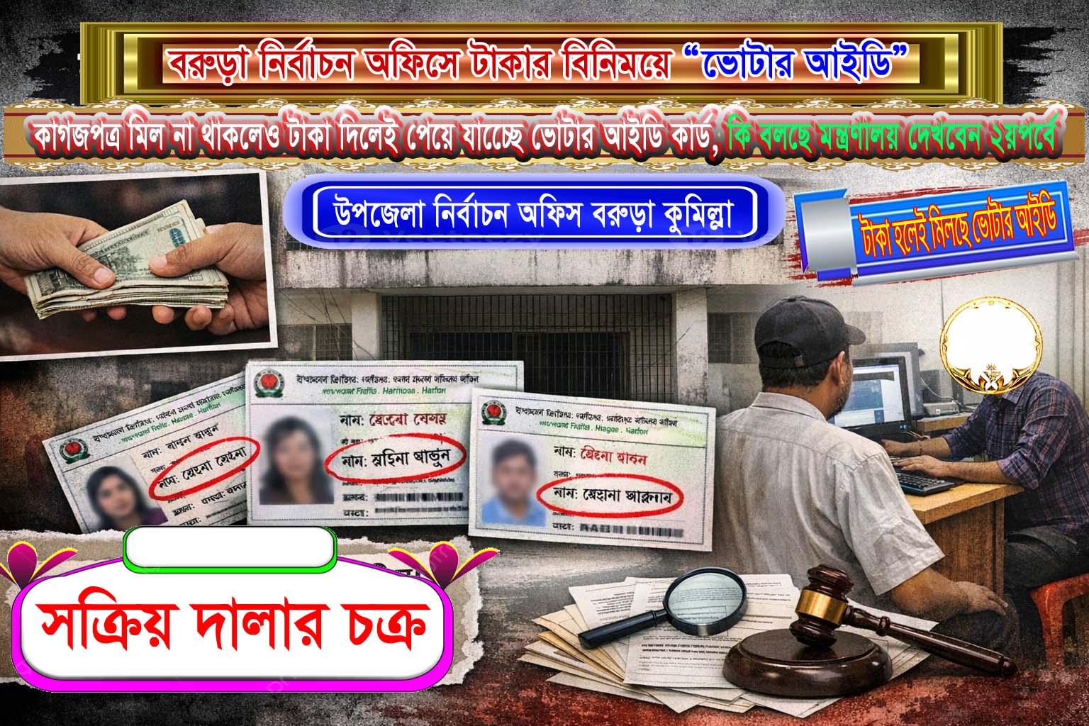 রাষ্ট্রের সবচেয়ে গুরুত্বপূর্ণ পরিচয়পত্র জাতীয় পরিচয়পত্র (এনআইডি) এখন যেন টাকার বিনিময়ে ‘বিক্রির মাল’! কুমিল্লার বরুড়া উপজেলা নির্বাচন অফিসকে ঘিরে উঠেছে এমনই বিস্ফোরক অভিযোগ, যা পুরো নির্বাচন ব্যবস্থাকে প্রশ্নবিদ্ধ করে তুলেছে।